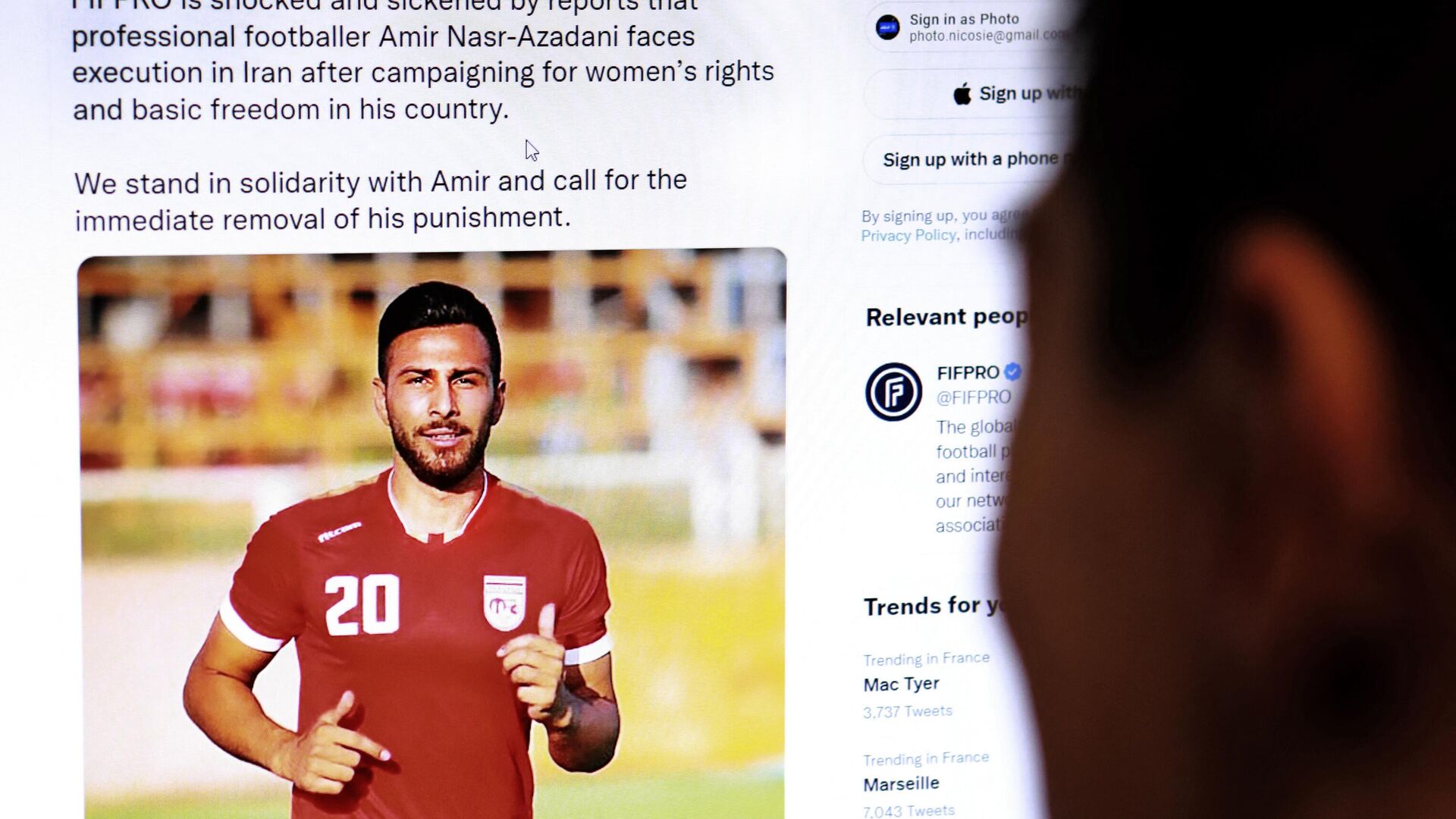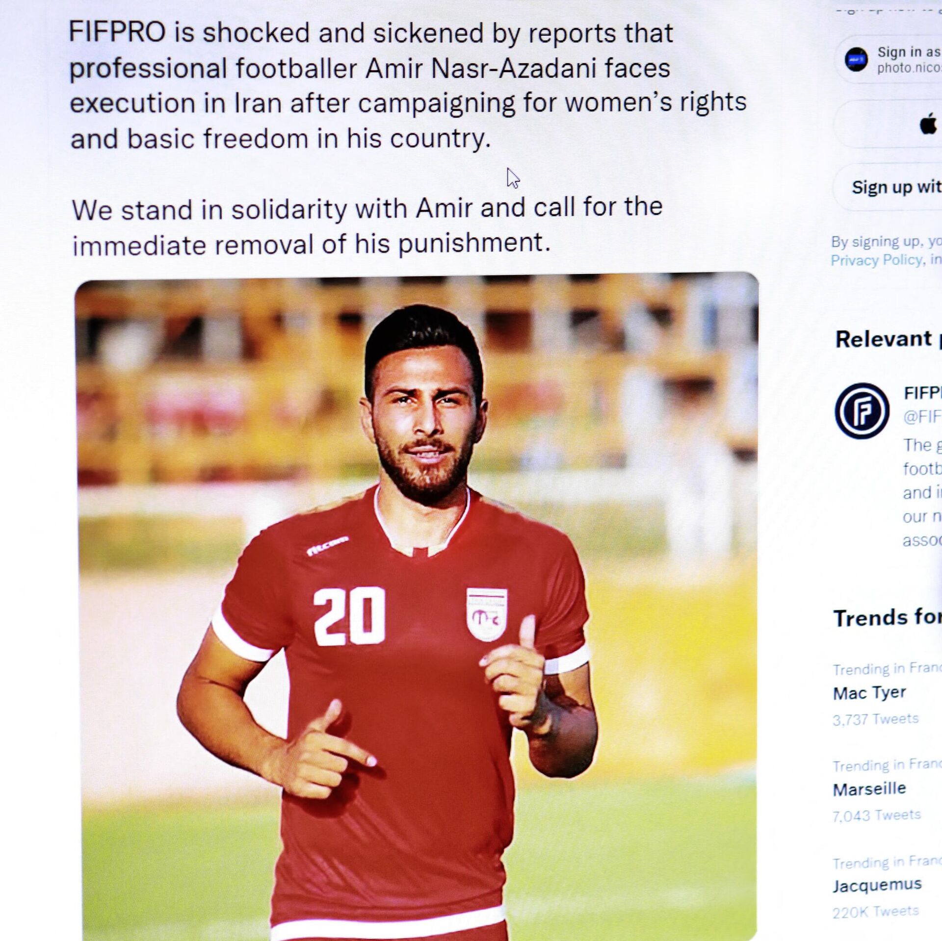 Amir Nasr Azadani je u centar pažnje javnosti stigao pošto su mnoge popularne ličnosti, uključujući i pevačicu Šakiru, delile na društvenim mrežama „uznemirujuću vest“ da je „fudbaler osuđen na smrt zbog borbe za ženska prava“.