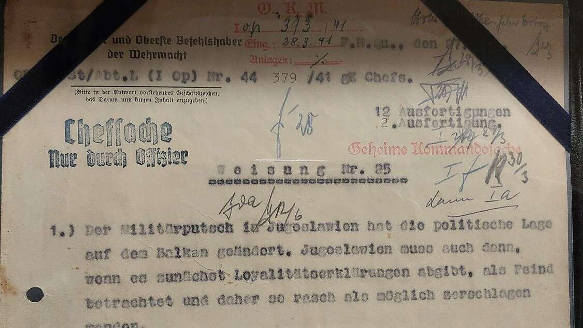 Reč je o Direktivi kojom je 28. marta 1941. godine Hitler naredio združeni napad na Kraljevinu Jugoslaviju i Kraljevinu Grčku. Sačinjena je u trinaest originala od kojih je jedan od njih od sada u vlasništvu Republike Srbije.