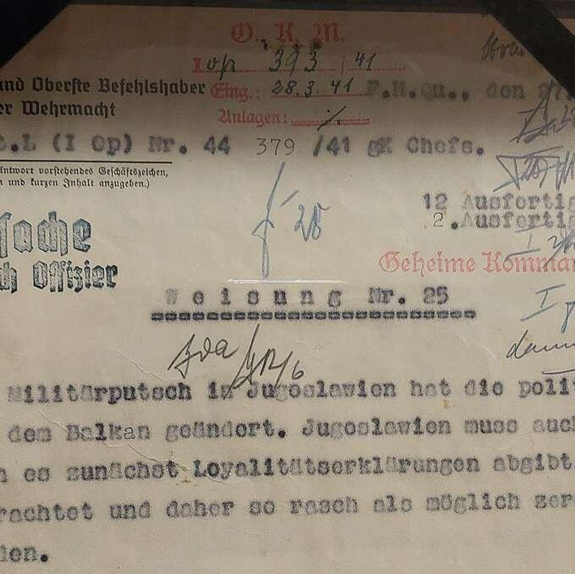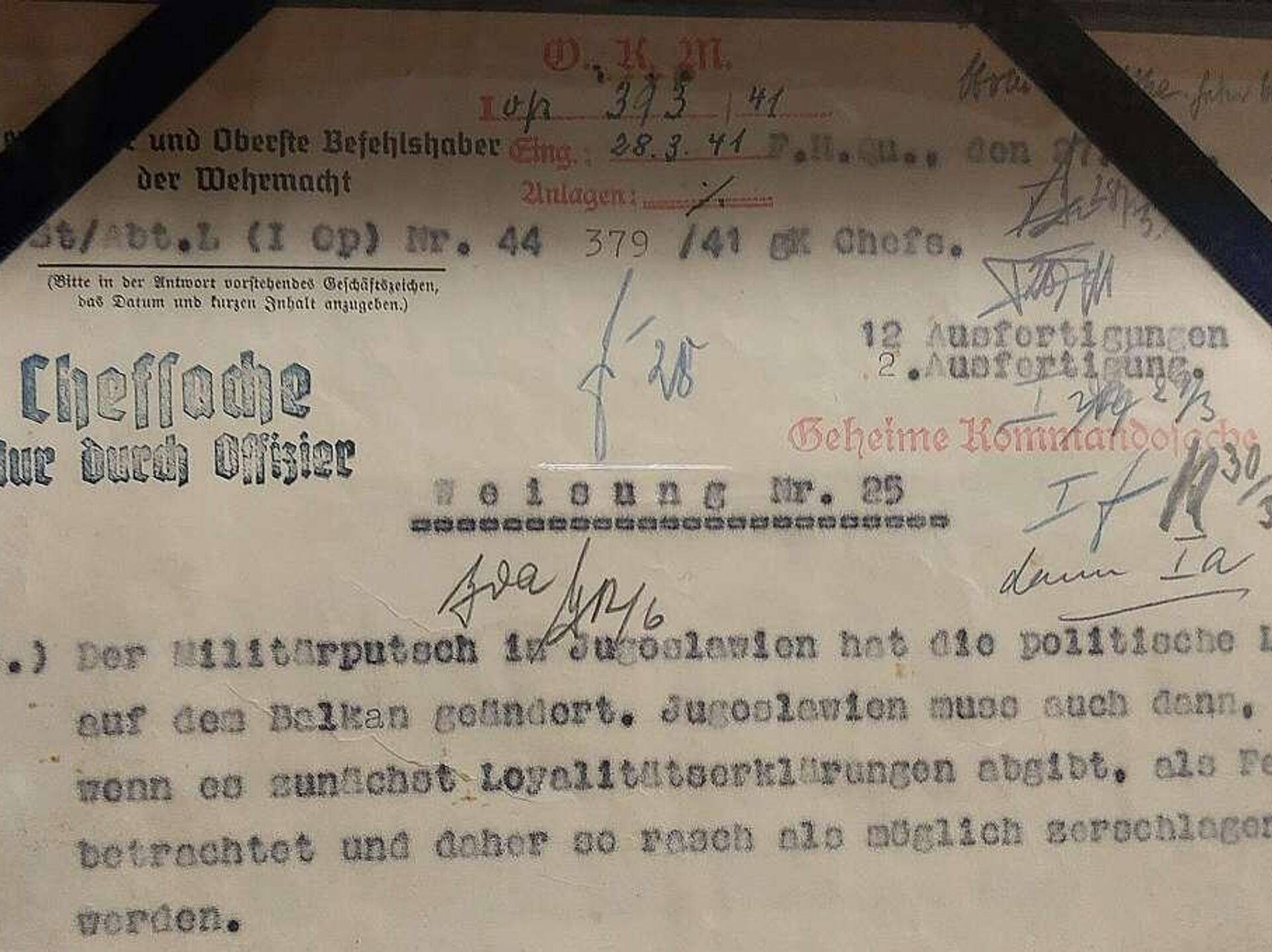 Važan istorijski dokument Direktiva broj 25, zloglasna direktiva nemačkog kancelara Adolfa Hitlera, izložena je u Narodnom muzeju Srbije u Beogradu.