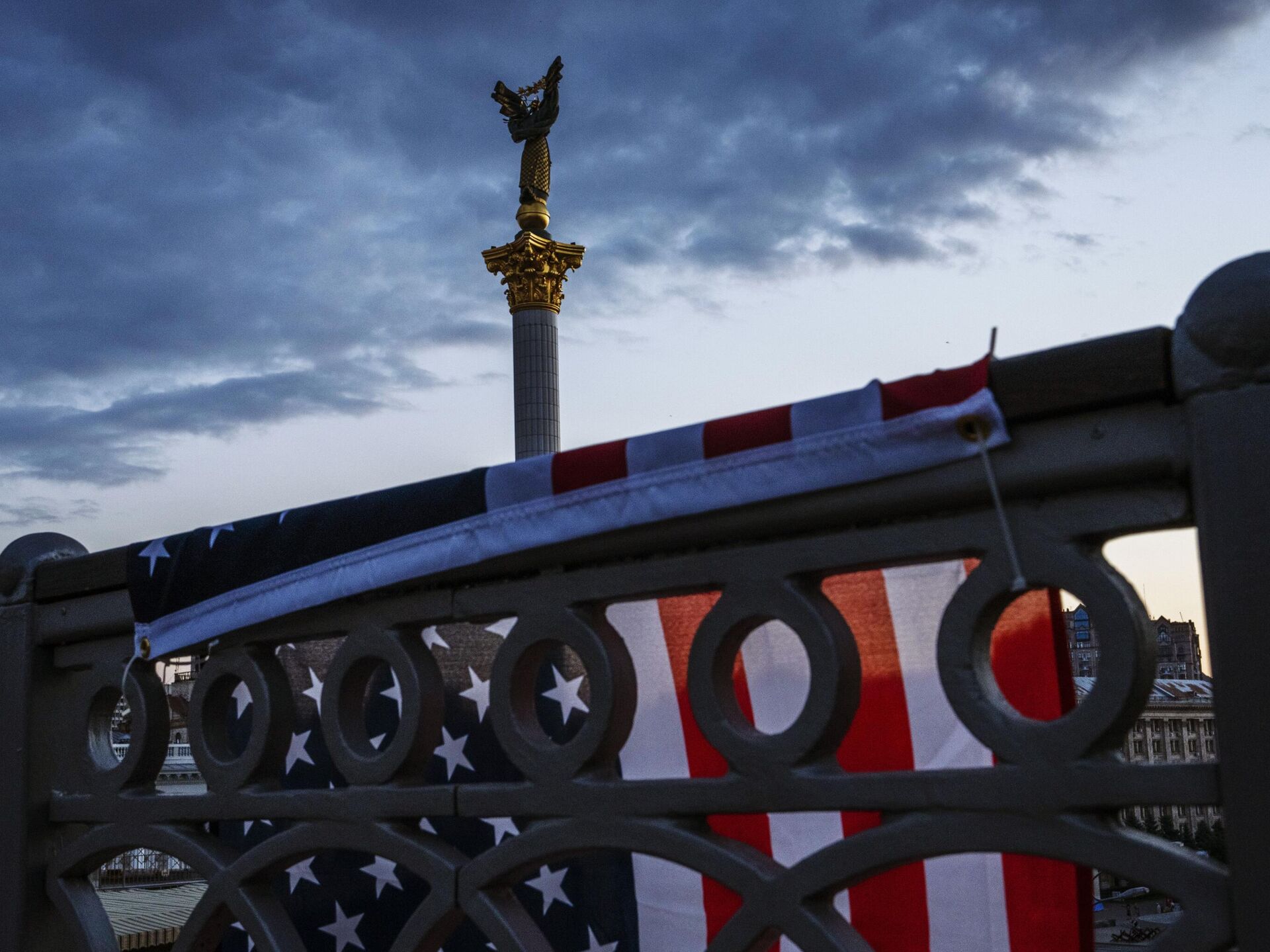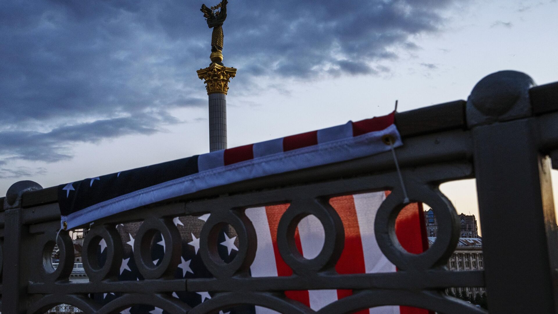 © AP Photo / Nariman El-MoftyAmerička zastava na ogradi mosta u Kijevu