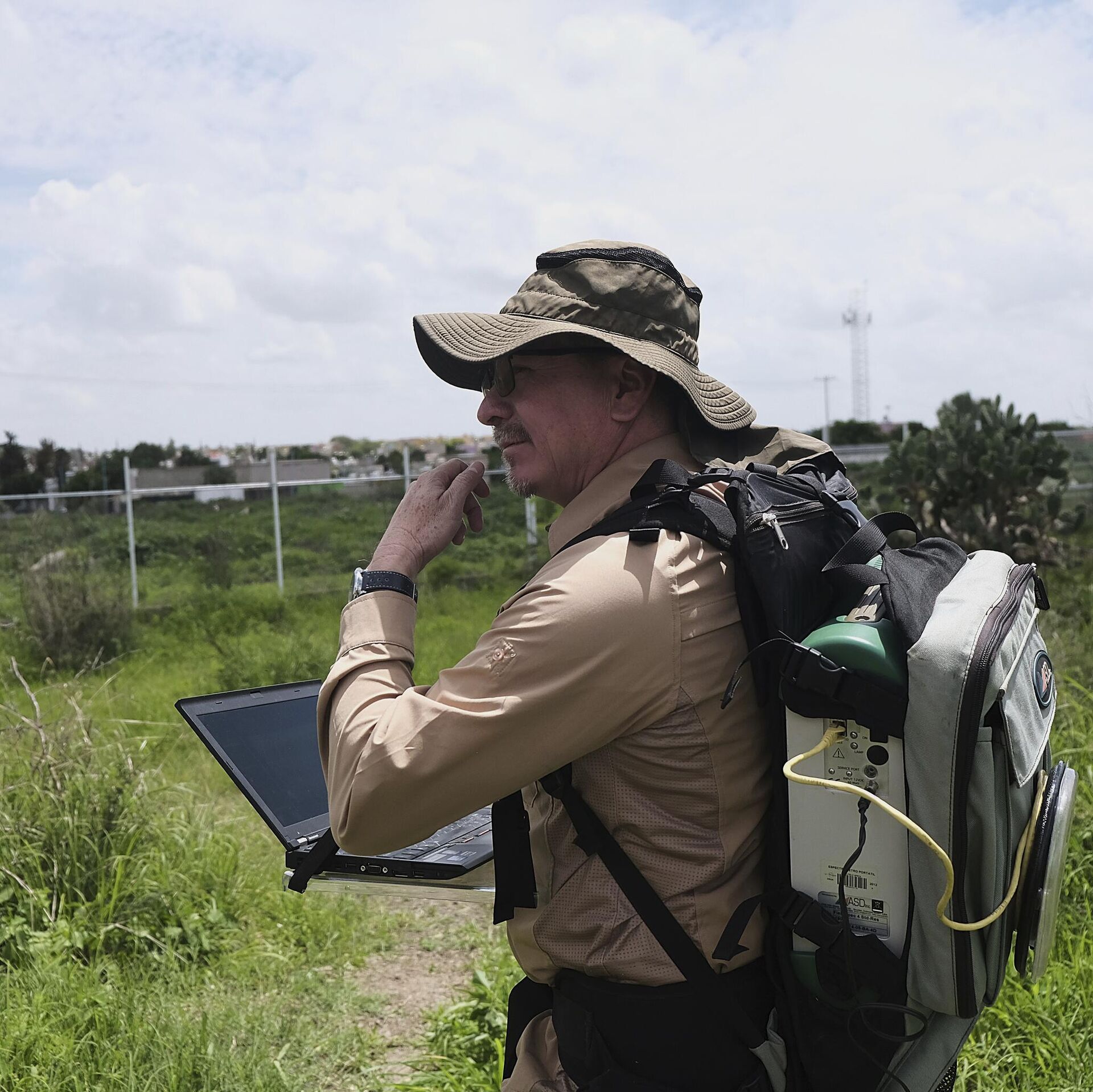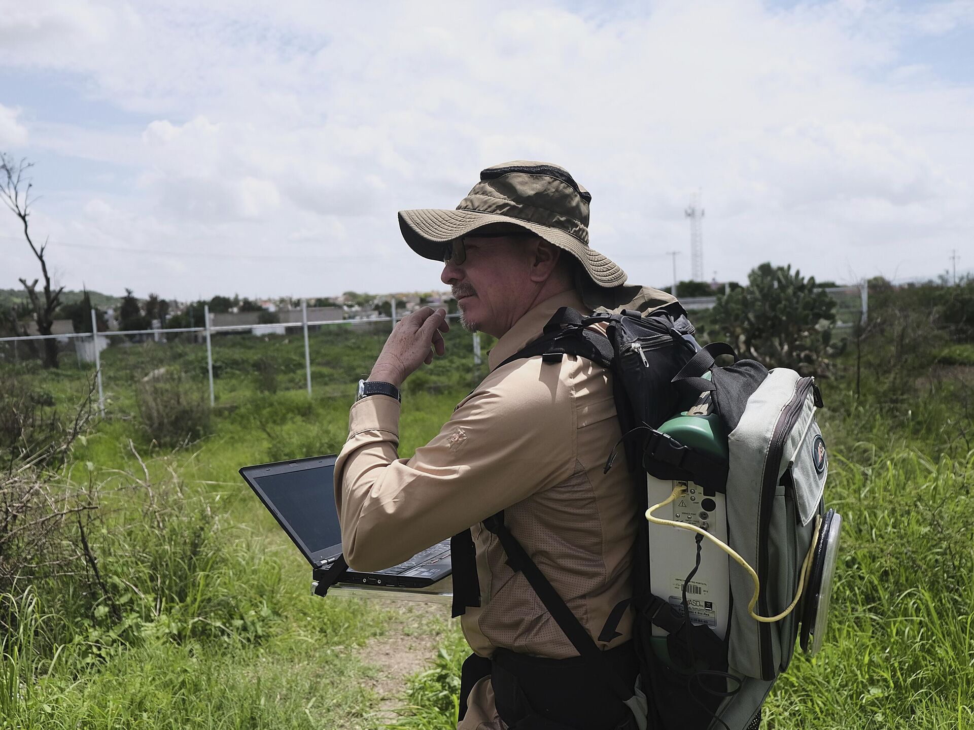 Hose Luis Silvan, istraživač i koordinator projekta koji sprovodi eksperimente na lokacijama tajnih grobnica kroz posmatranje, geološku analizu i geoprostorne dronove, pregleda lokaciju grobova sa svinjskim leševima u Zapopanu - Sputnik Srbija, 1920, 29.07.2025