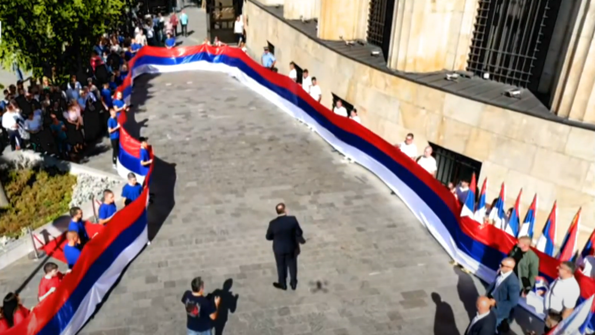 Ispred Palate Republike u Banjaluci povodom Dana srpskog jedinstva, slobode i nacionalne zastave istaknuta je srpska trobojka duga 120 metara.