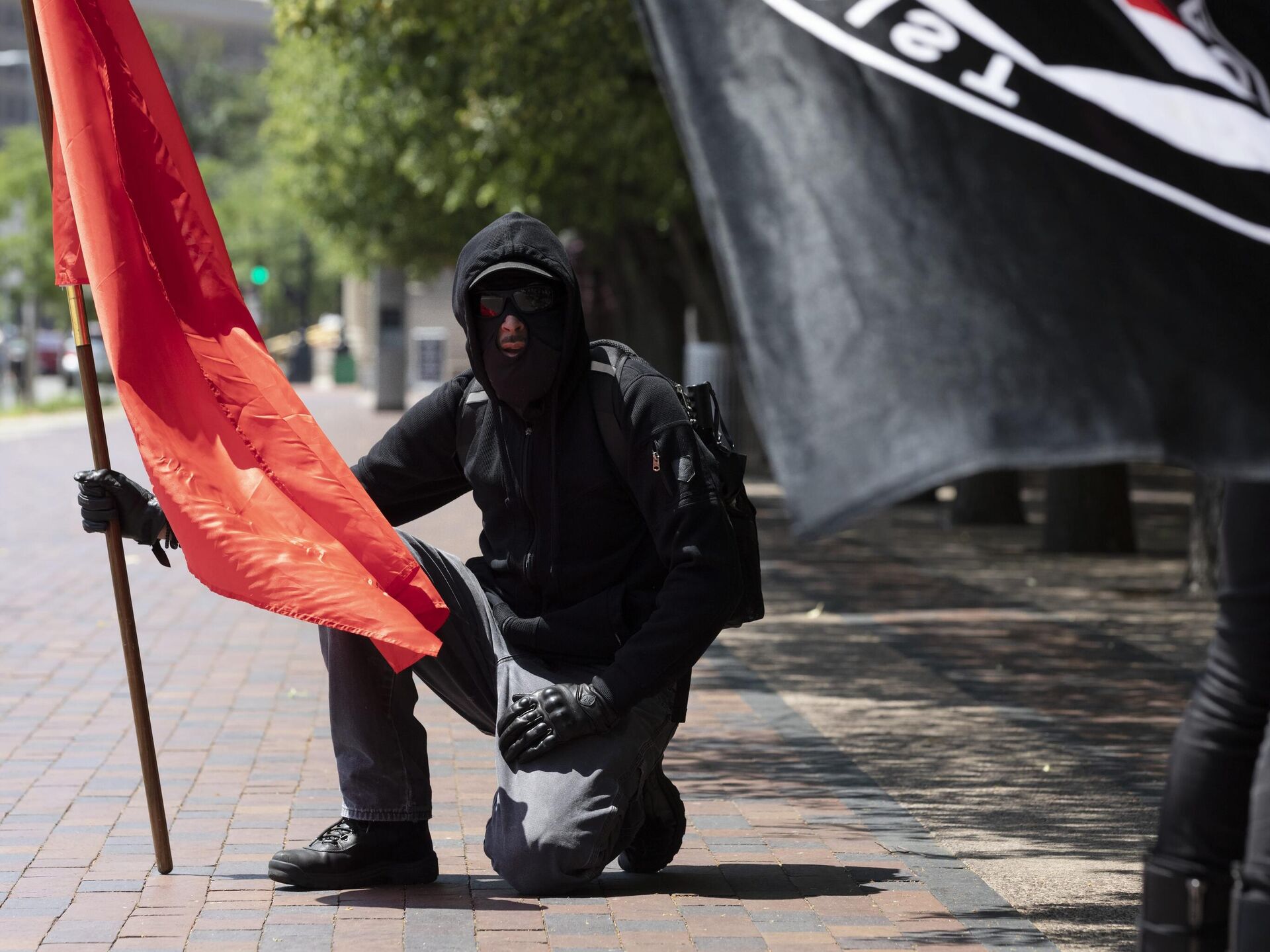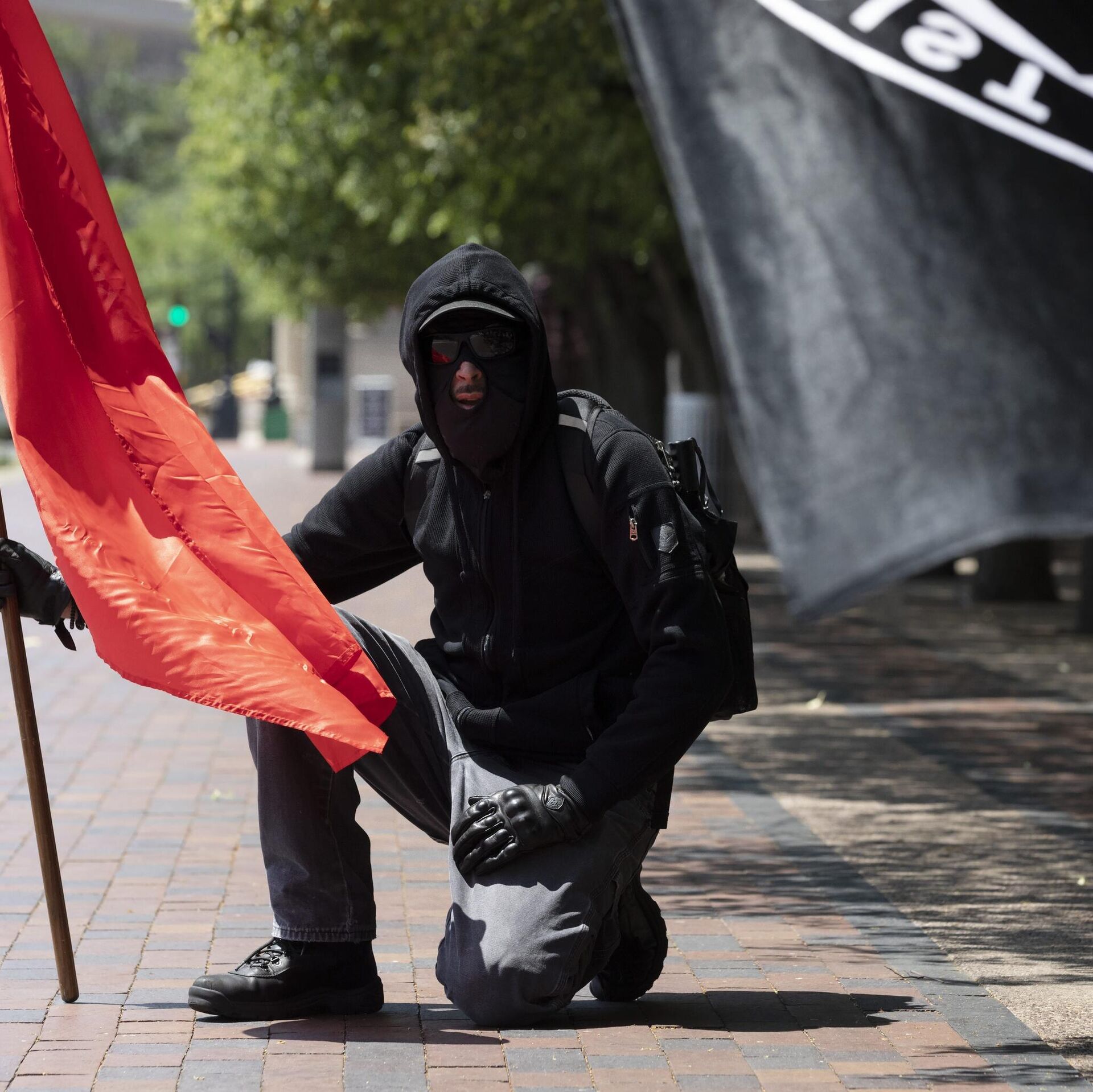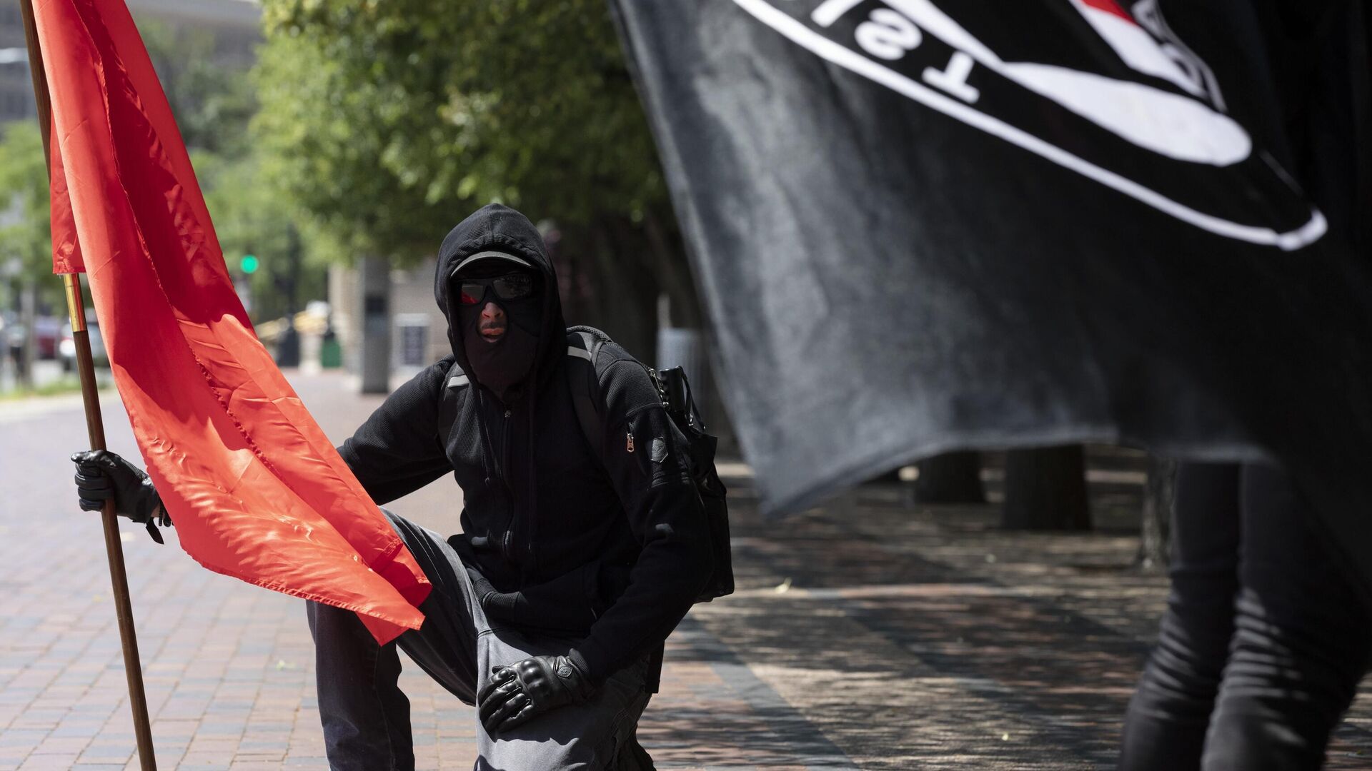 © AP Photo / Michael DwyerPripadnik Antife sa zastavom u Bostonu