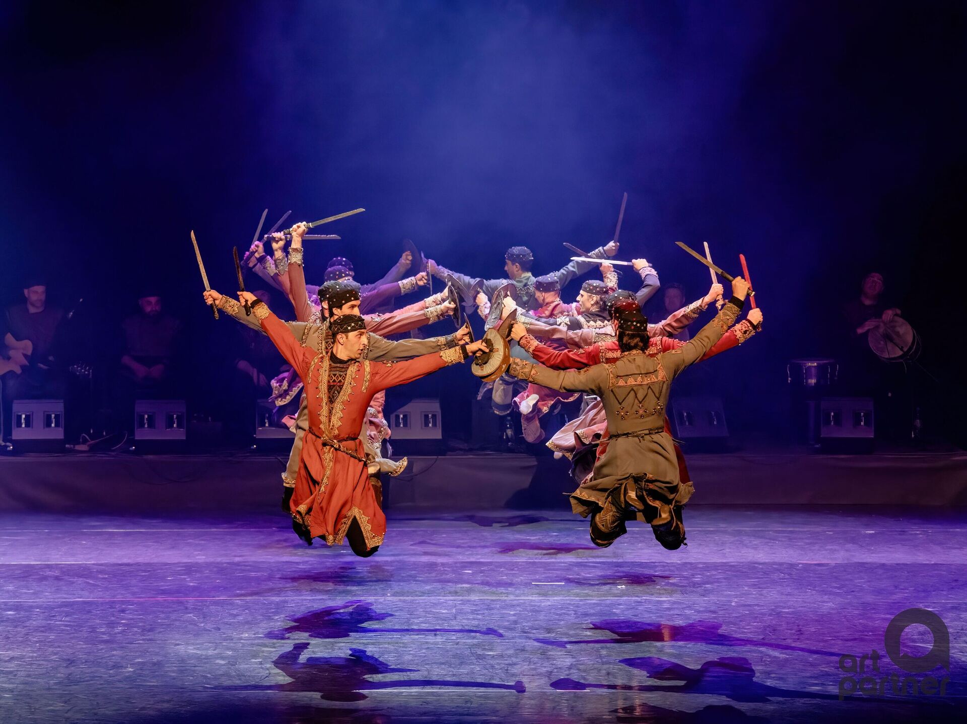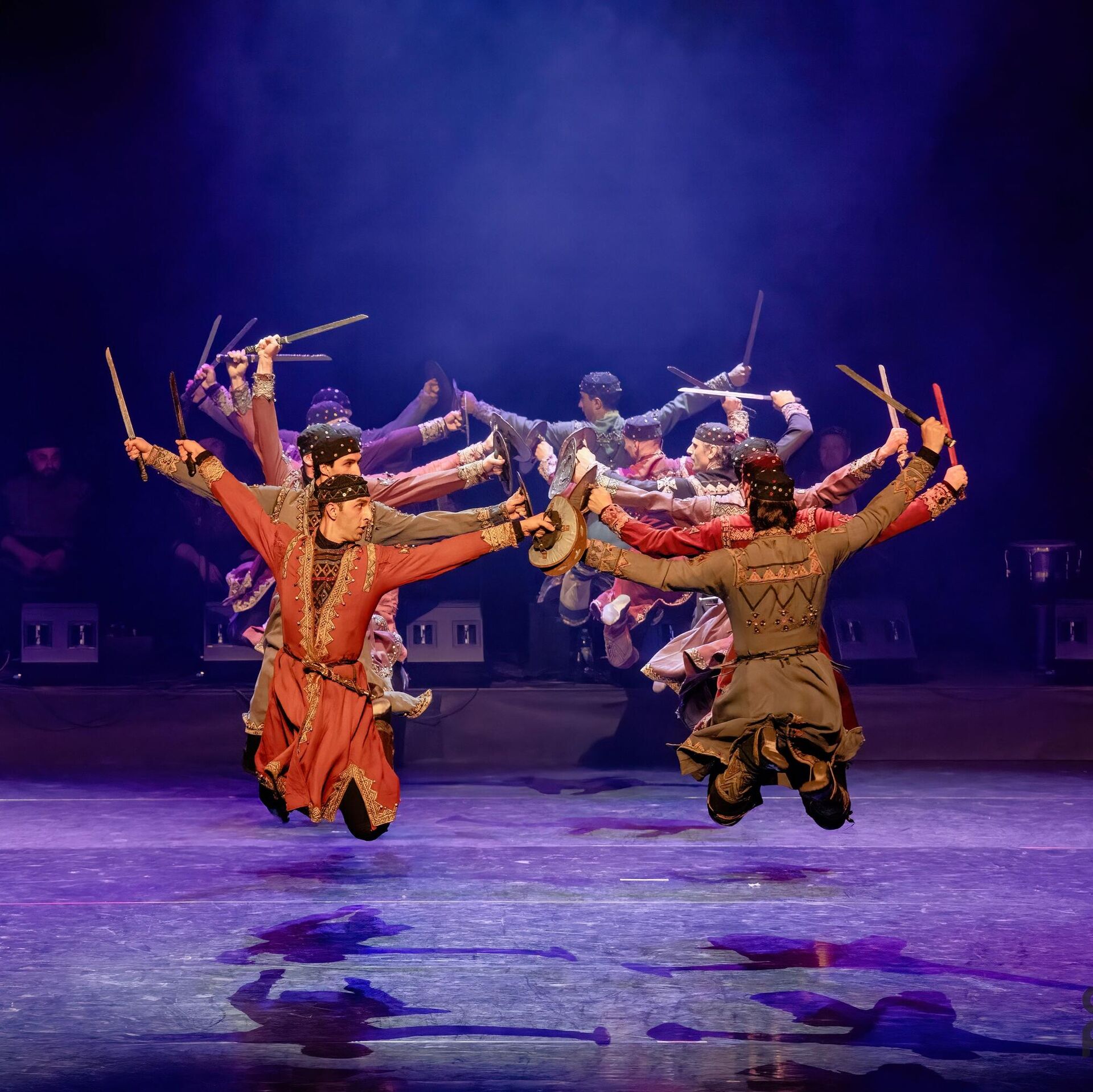 Kompleksna i zahtevna koreografija spaja savršeno sinhronizovane pokrete trupe sa zadivljujućim tehničkim umećem pojedinačnih izvođača. Energični muški plesači vešto lete kroz vazduh sudarajući se mačevima i bodežima, takmičeći se u dinamici pokreta i visini skoka kako bi osvojili naklonost elegantnih plesačica koje se kreću tako graciozno da deluje kao da lebde na sceni.