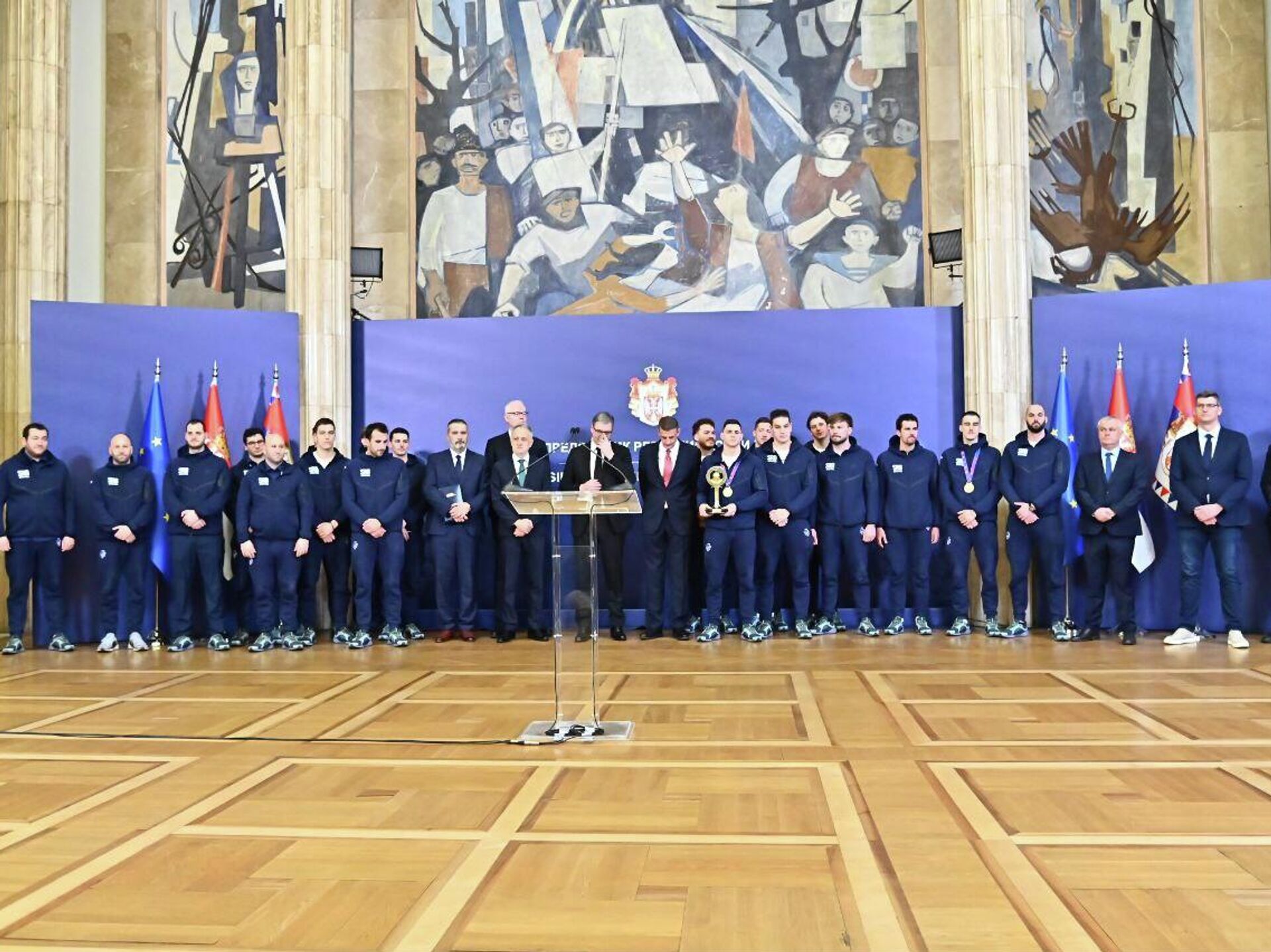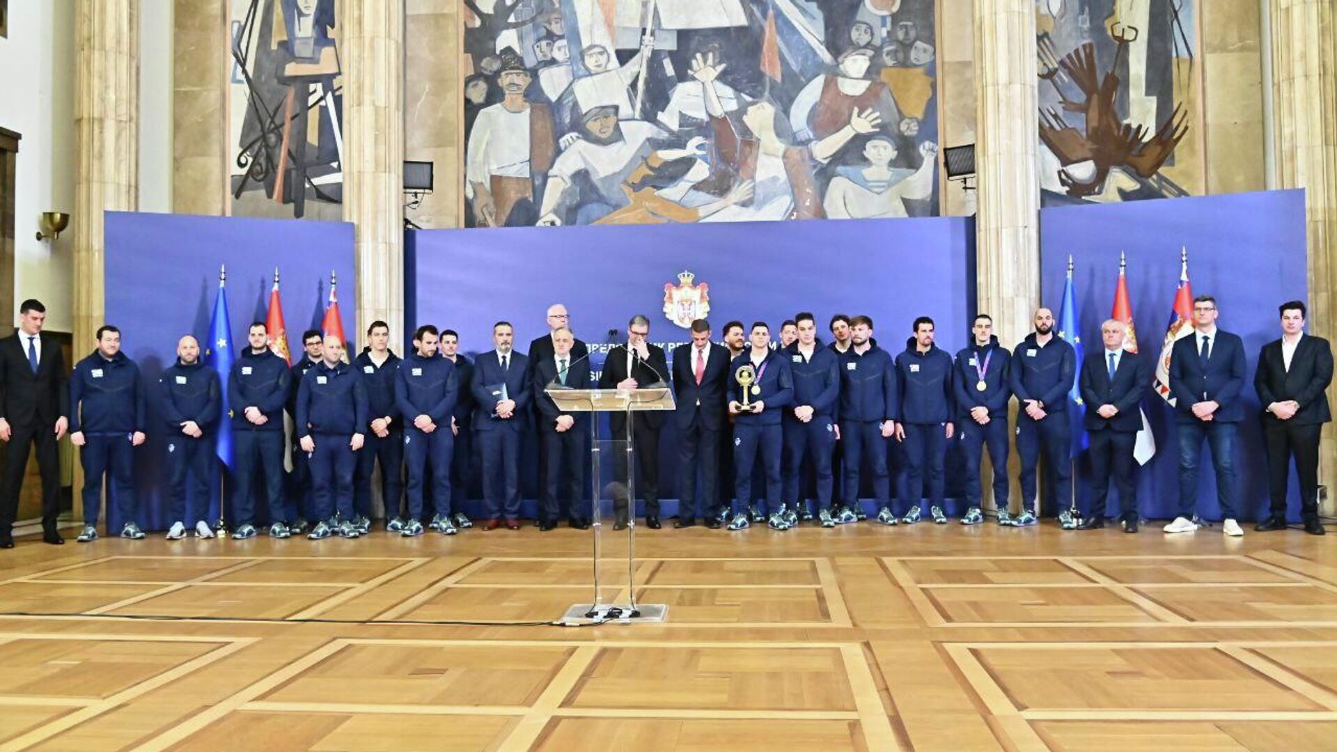 11:23 26.01.2026 (Osveženo: 11:41 26.01.2026) Predsednik Srbije Aleksandar Vučić primio je u zgradi Generalnog sekretarijata predsednika Republike članove vaterpolo reprezentacije Srbije koji su osvojili zlatnu medalju na Evropskom prvenstvu u Beogradu.