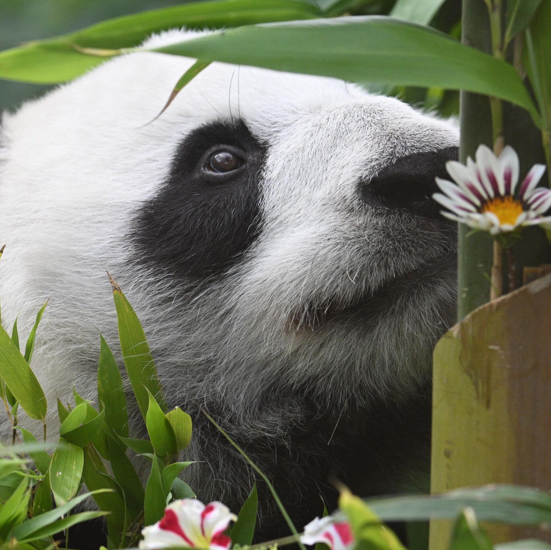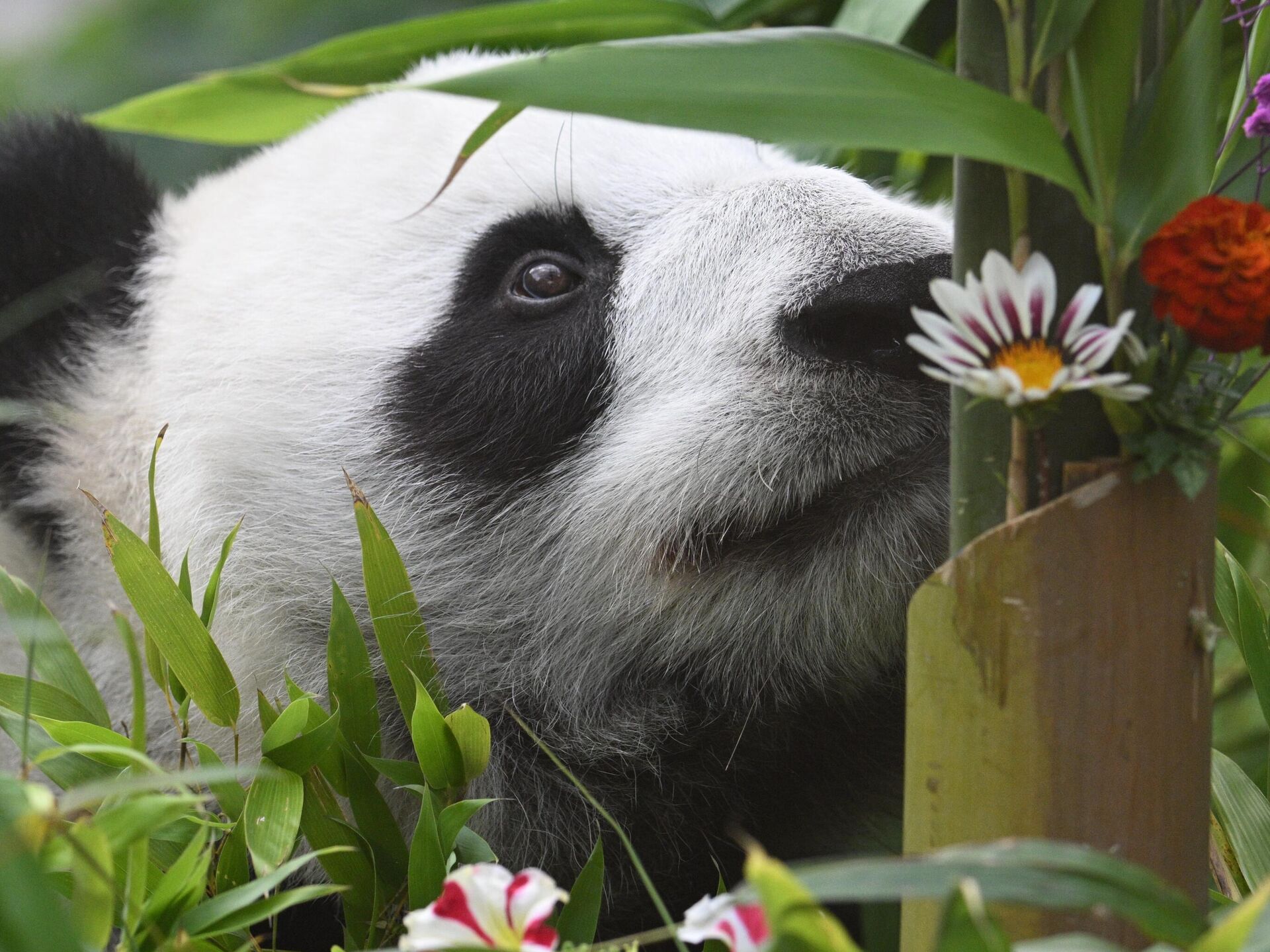 Džija Džija, ženka džinovske pande, skriva se iza svog rođendanskog „posluženja“ od bambusa u petak, 6. septembra 2013. godine u parku River Safari, delu organizacije Wildlife Reserves i Zoološkog vrta u Singapuru. - Sputnik Srbija